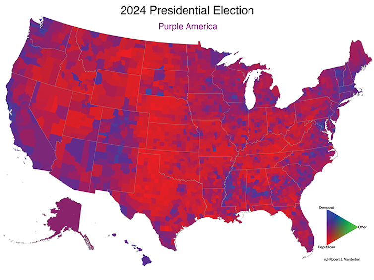 This work started as a curiosity project. Back in 2000, most maps of election results showed states colored either red or blue depending on which side had more votes in that state – Republican George W. Bush or Democrat Al Gore. But that one-or-the-other approach didn’t match up with an election that was so close, it was ultimately decided by 537 votes in Florida.