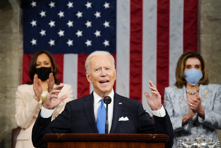 President Joe Biden spoke to Congress April 28, 2021, with a historic duo flanking him: two women, one of them African American. Vice President Kamala Harris called the proceedings to order; Speaker of the House Nancy Pelosi made the formal introduction of Biden to Congress. We asked three scholars to provide reactions to Biden’s speech, which began with a recounting of his administration’s accomplishments during its first 100 days and ended with his plea for unity so that America can “deliver on its promise.”