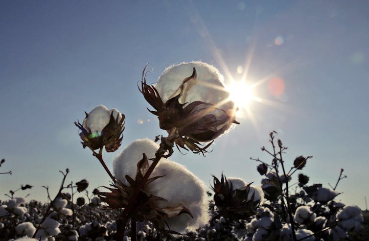 Climate change is raising average global temperatures, and some important cotton-producing regions like the U.S. Southwest are becoming drier. Cotton is already a crop accustomed to heat – our research plots can thrive in temperatures as high as 102 degrees Fahrenheit (39 C) – but one cotton plant requires about 10 gallons (38 liters) of water over the course of a four-month growing season to achieve its maximum yield potential.