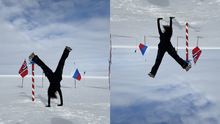 This is the right way up: Abigail Bishop does a handstand at the ceremonial South Pole. Abigail Bishop