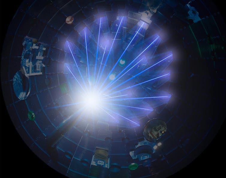 However, it is very difficult to achieve nuclear fusion on Earth. Fusion happens only at extreme conditions, such as the very high temperatures and pressure of the Sun. Scientists have yet to effectively demonstrate controllable nuclear fusion that produces more energy than it consumes, but they are working hard to do so. One way is to shoot high-power lasers from different directions at a tiny speck of hydrogen isotopes.