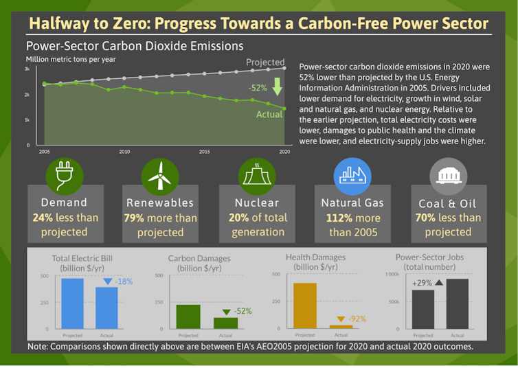 The most effective way to reduce greenhouse gas emissions from home energy consumption is to substitute electricity generated from low- and zero-carbon sources for oil and natural gas. And the power sector is rapidly moving that way: As a 2021 report from Lawrence Berkeley National Laboratory showed, power producers have reduced their carbon emissions by 50% from what energy experts predicted in 2005.
