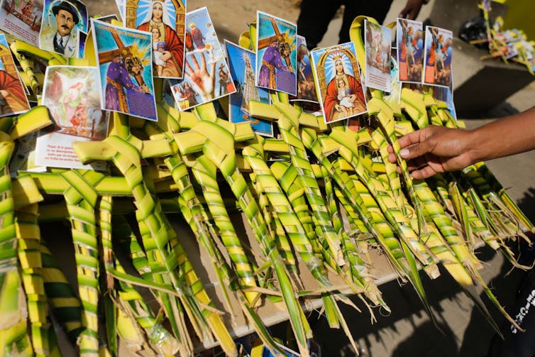 Palm Sunday commemorates the story of Jesus’ triumphal entry into Jerusalem shortly before the Jewish holiday of Passover. According to the Christian Gospels, people lined the streets to greet him, waving palm branches and shouting words of praise.