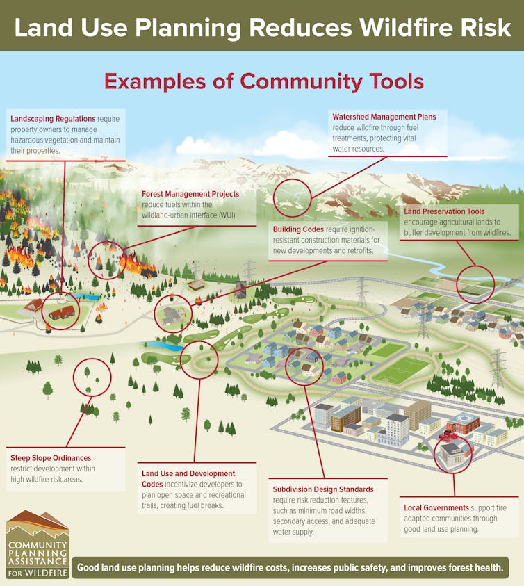 Carefully planning how land is used in communities can lower the risk to homes and property. A site’s vegetation types, weather and wind patterns, and slope of the ground can all affect how a fire spreads. Planning also ensures firefighters have road access to reach homes in all weather and identifies water sources for firefighting.