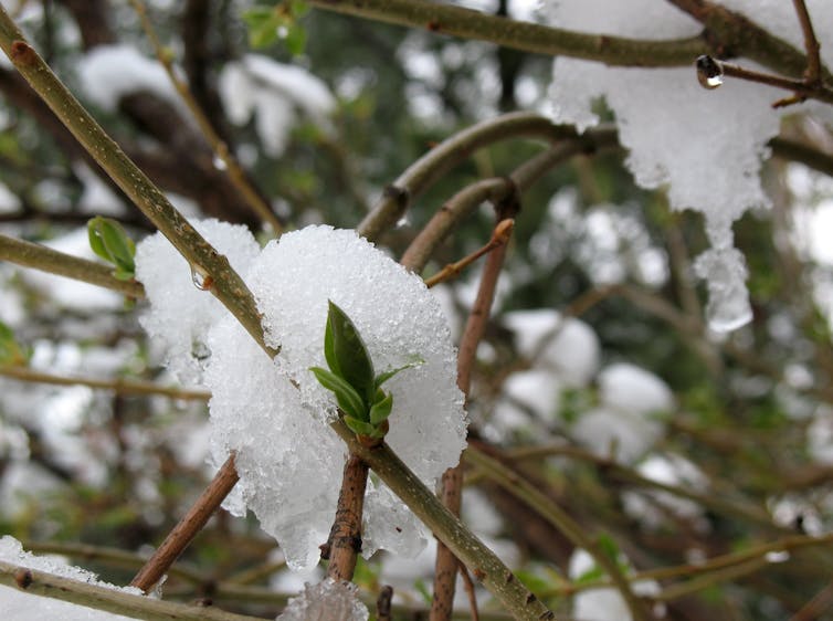 After plants stoically withstand cold winters, early spring brings new dangers. Plants need to leaf out as early as they can in spring to take full advantage of the growing season. But this involves pumping water into their developing leaves, which reduces the concentration of sugars, salts and organic compounds in their tissues and removes their winter protection from cold.