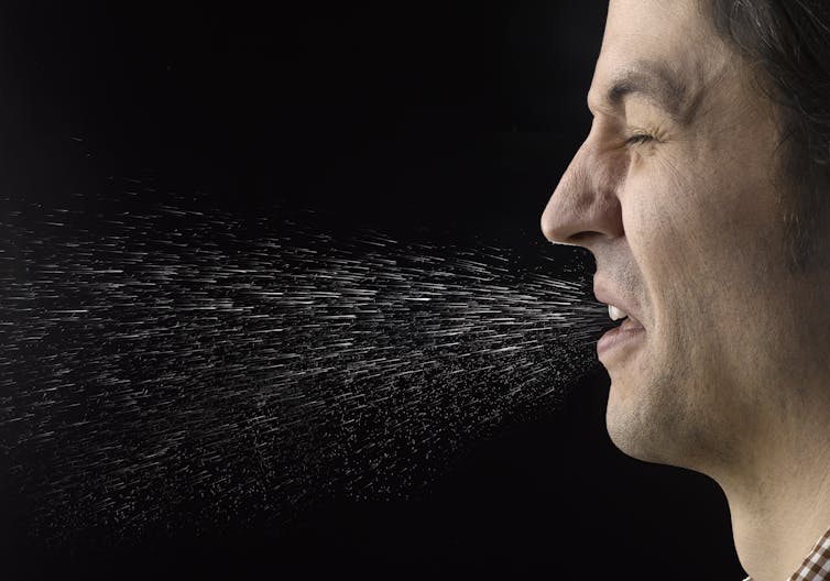 When someone coughs, talks or even breathes, they send tiny respiratory droplets into the surrounding air. The smallest of these droplets can float for hours, and there is strong evidence that they can carry live coronavirus if the person is infected.