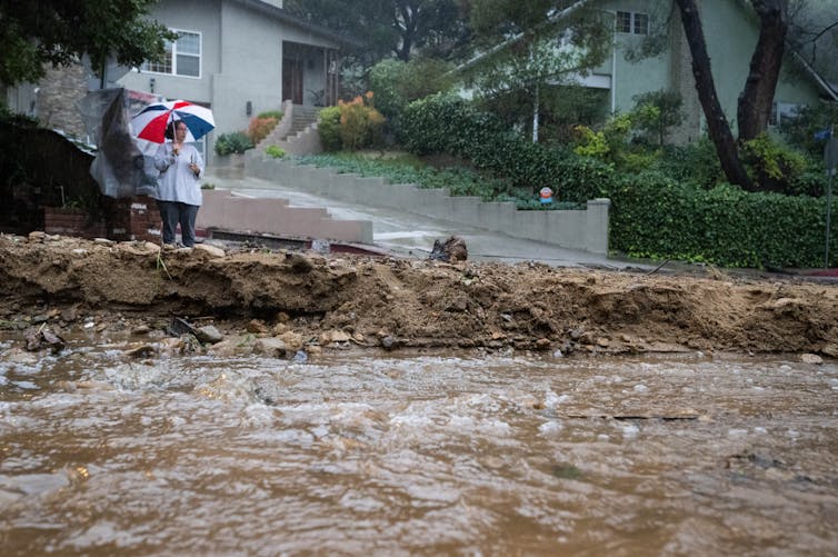 Wildfire burn scars are particularly risky because wildfires strip away vegetation and make the soil hydrophobic – meaning it is less able to absorb water. A downpour on these vulnerable landscapes can quickly erode the ground, and fast-moving water can carry the debris, rocks and mud with it.
