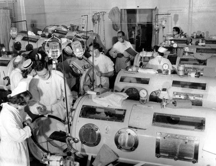 In the worst cases of paralytic polio, the virus can damage the centers of the nervous system that control breathing. Respirators known as “iron lungs” were early medical devices that aided those with damaged respiratory muscles, helping them breathe until their muscles healed enough to work on their own. Patients could die when the paralysis was severe and sustained.