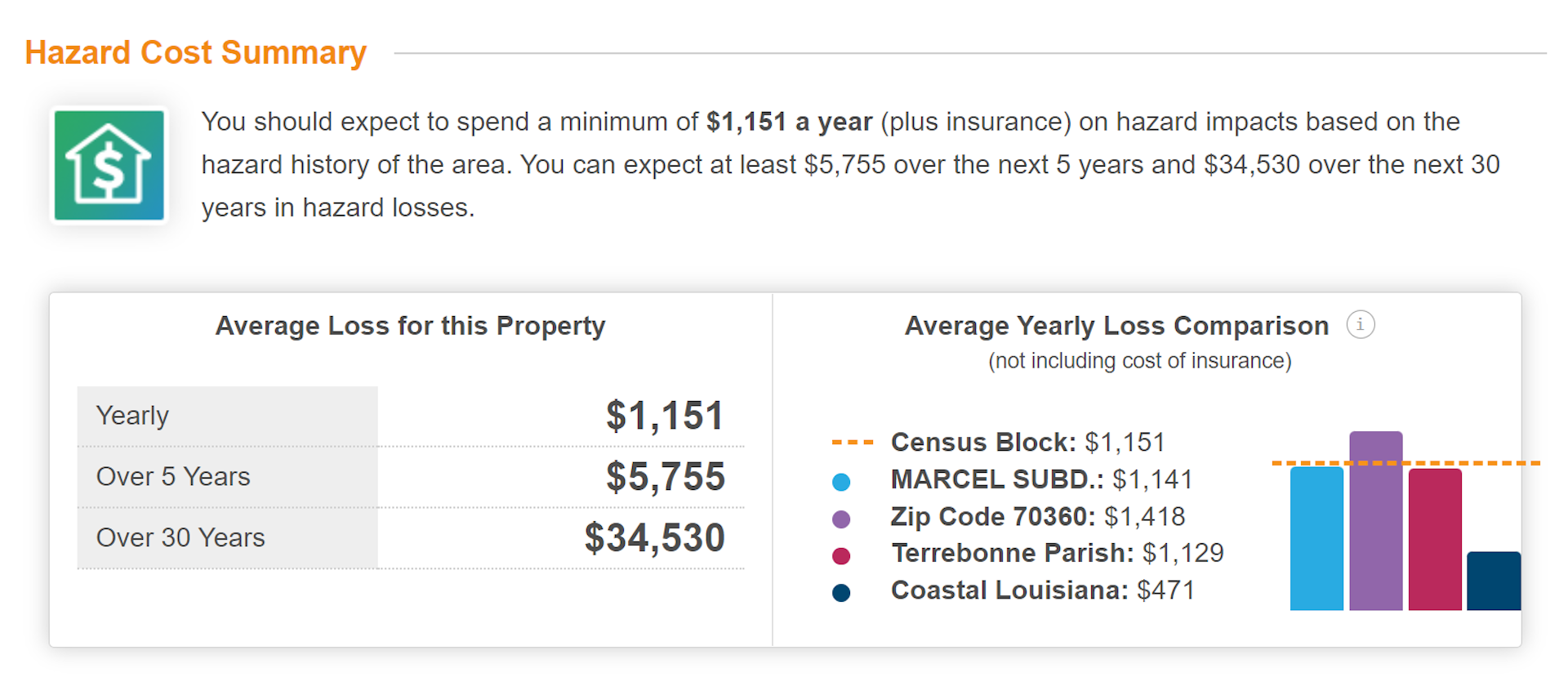 Rather than just presenting a score, the tool offers information on the costs annually and over time that one can expect from each hazard, such as flooding or wind damage, and how the home’s census block compares with the local area, county and state. To capture the effects of sea-level rise, for example, we model the number of years it will take for a home to go from outside a high flood risk area to being inside.