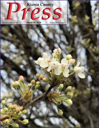 Shown below - the front page of the March 29, 2024, Kiowa County Press - Blossoms on an ornamental tree in Kiowa County. - Chris Sorensen.